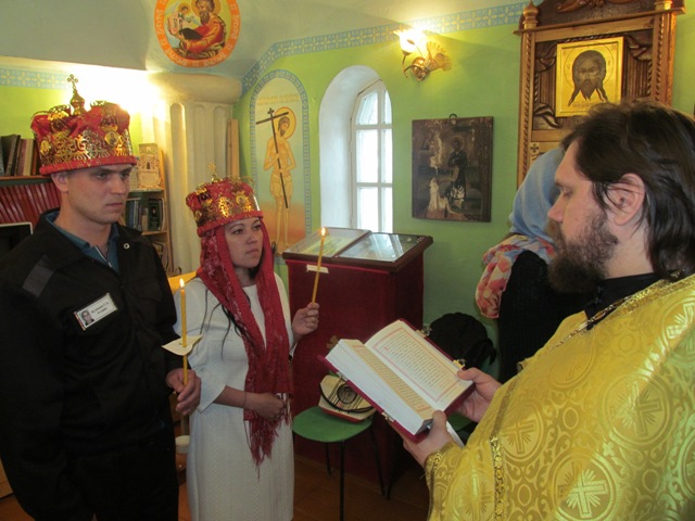 Таинство совершил руководитель отдела тюремного служения Сарапульской епархии протоиерей Николай Экс. Молодожены, осужденный Сергей и Анисия, дали клятву на верность пред Богом подтвердили свою любовь и преданность друг другу.